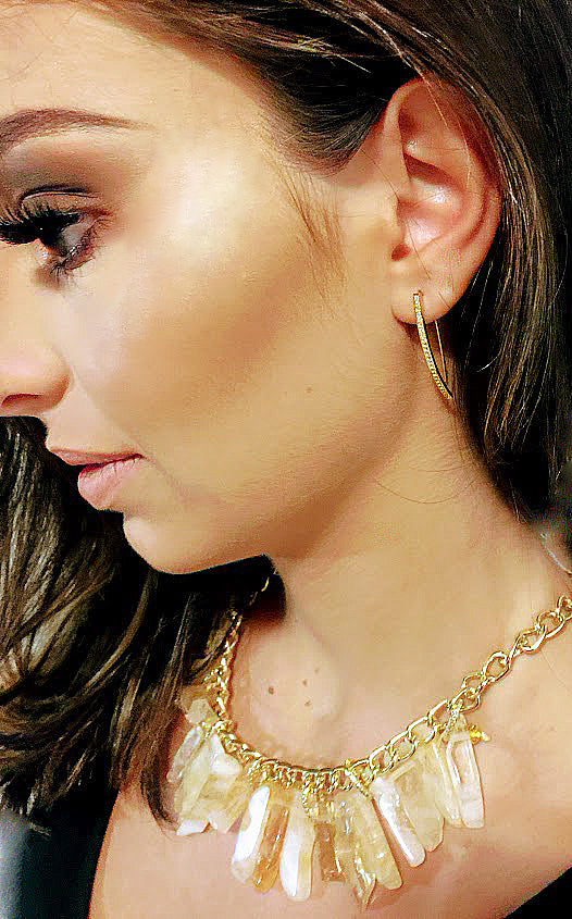 - This piece features handpicked chip stones that are suspended by a soft gold tone chain.