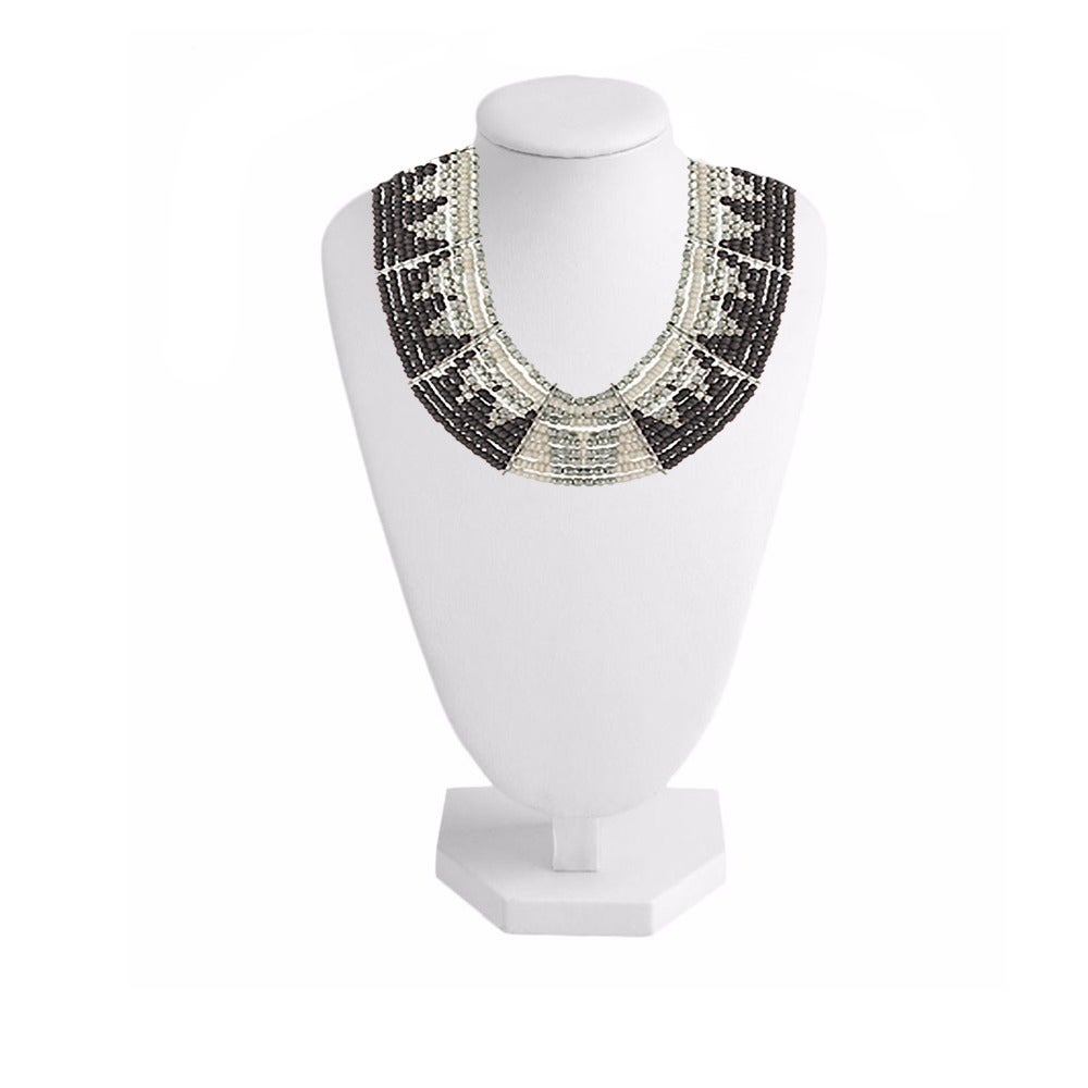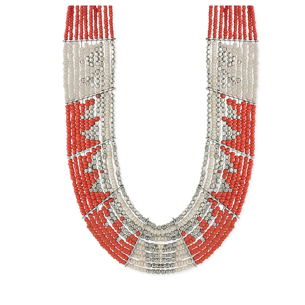 Enjoy this elaborate beaded necklace, featuring strands of glass beads and luxurious silvertone bar stations.